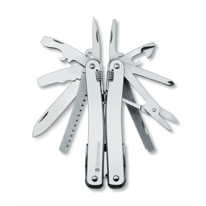 Especificaciones: estuche de nylon. 1. alicate de punta fina 2. destornillador 2 mm 3. destornillador 3 mm 4. corta alambre delgado (alambres delgados suave hasta 40 HRc) 5. abrebotellas 6. destornillador 6 mm 7. palanca 8. hoja, puntiaguda 9. tijeras 10. lima para metal 11. sierra para metal 12. sierra para madera 13. punzón-escariador 14. destornillador «Phillips»1+2 15. cincel 16. pelacable corte longitudinal 17. encorvador de alambres 18. desaislador limpiador alambres 19. pelacable de corte circular 20. abrelatas 21. gancho de arrastre 22. estuche piel marrón o Nylon 23. orificio para sacacorchos 24. corta alambres endurecido 25. orificio para colgar 26. 10 resortes individuales 27. bloqueo corredizo SWISS TOOL Spirit es producida por la misma empresa que desde hace más de 100 años fabrica la navaja «Swiss Army Knife» original, la primera multiherramienta famosa en toda el mundo. La robusta SwissTool es reconocida por los especialistas desde 1999 debido a su extraordinaria variedad de funciones, su versatilidad y su sencilla manipulación. La Spirit, su sucesora, es más ergonómica y elegante, y a pesar de su peso de sólo 205 g, en lugar de 285 g.