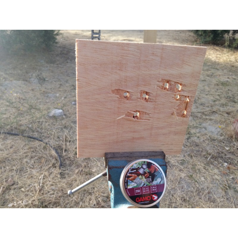 Impacto de un Diábolo pro-hunter en un tablero de 2 cm a una distancia de 10metros con una carabina de gamo wisper x.