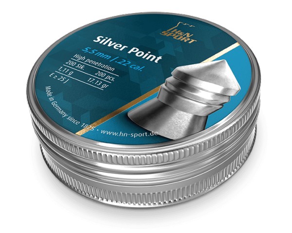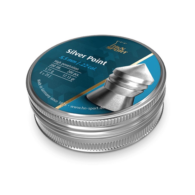 Balín H&N modelo Silver Point. Balín de caza pesado y preciso para distancias medias. Alto poder de perforación y profundidad con máximo efecto de choque. Liso con estrías. Calibre: 5,5 mm. Peso: 1,11 g