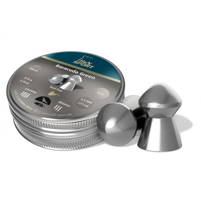 Balín H&N modelo Baracuda Green. Balín de alta velocidad sin plomo y ligero con una precisión extraordinaria para la competición y la caza. Velocidad cercana a la del sonido con trayectoria de vuelo muy plana para distancias medias. Alto poder de perforación y agrupaciones pequeñas. Calibre: 4,5 mm. Peso: 0,43 g. Uso recomendado: Caza y Field Target.