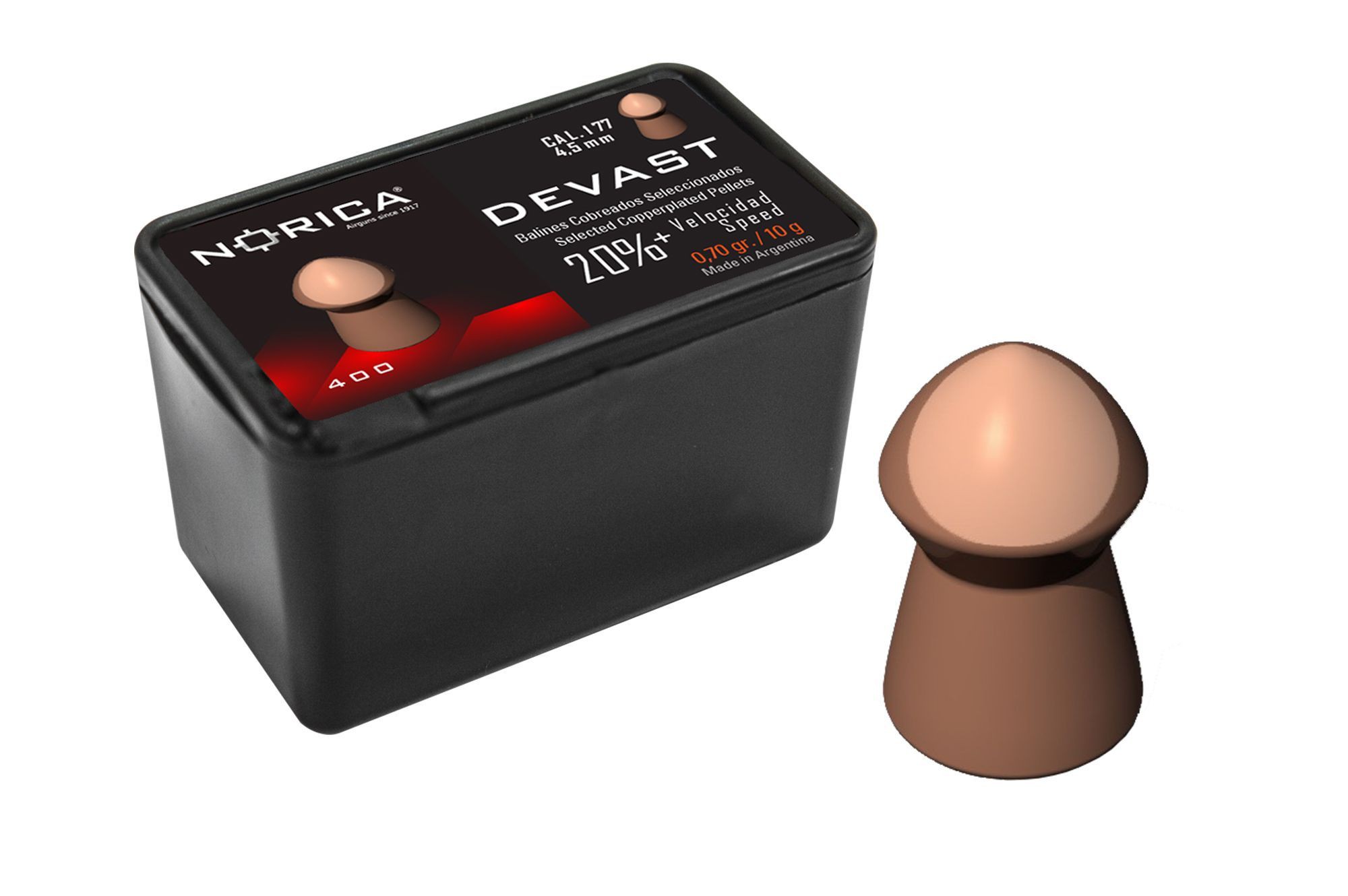 Los balines Norica Devast tienen un diseño aerodinámico y completamente equilibrado, útil para disparos a larga distancia con poder de penetración, así como para control de plagas. Este perdigón ha sido fabricado con una combinación de plomo y cobre, y la caja está compuesta por 400 unidades.
