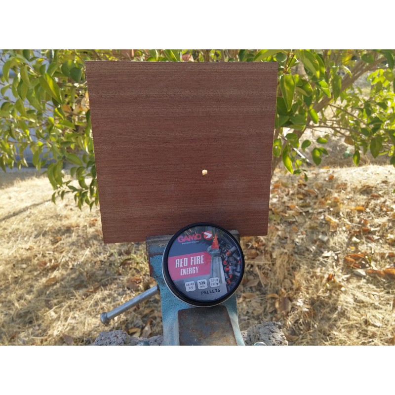 Impacto de un Diábolo red fire en un tablero de 2 cm a una distancia de 10 metros con una carabina de gamo wisper x.