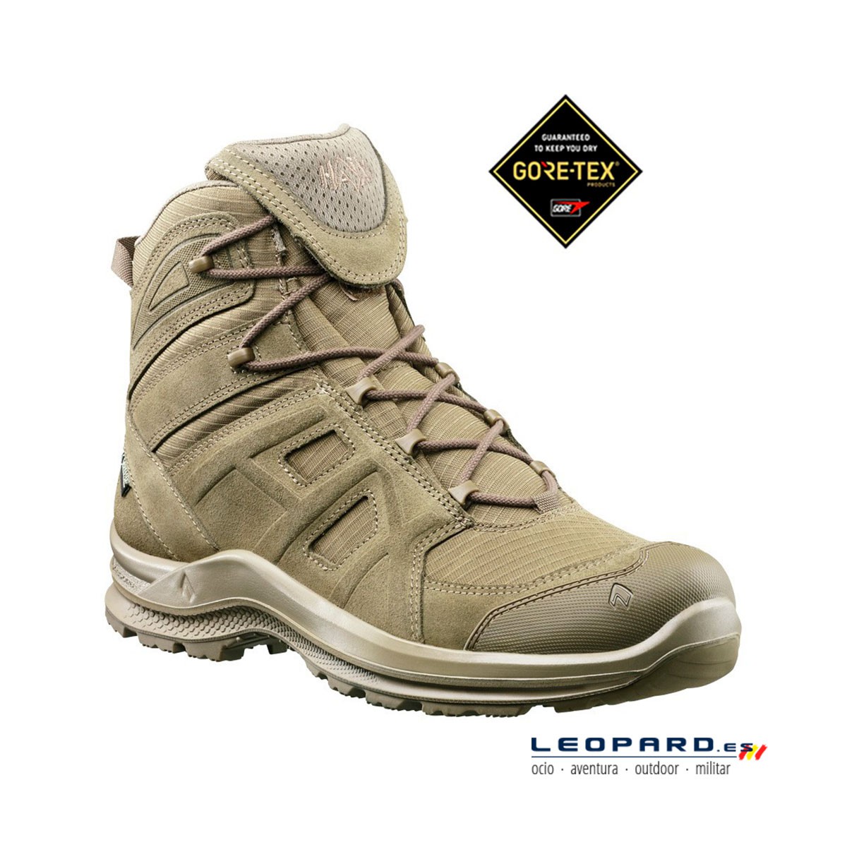 Bota Haix de caña media de 6" de color arena. Fabricada en piel y textil transpirable con membrana GORE-TEX® de 3 capas resistente a la abrasión. Estabilizador de TPU uso asimétrico para estabilizar el talón. Suela antideslizante resistente al aceite y la gasolina, fabricada en EVA/TPU. Sistema climático: HAIX®. Cordón de 2 zonas HAIX®. Es una bota táctica recomendada tanto para policías, vigilantes de seguridad y cuerpos de seguridad del estado. También está recomendada para servicios de emergencias y protección civil.