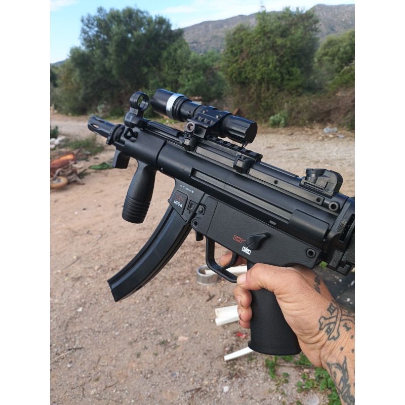 Fabricado por Umarex, este subfusil H&K es una réplica exacta en acabados y prestaciones del HK MP5 K del calibre 9 mm Parabellum de fuego real, utilizado por la policía, las fuerzas militares y unidades especiales de todo el mundo. Este modelo cuenta con otras características que se encuentran en el original, como un carril de montaje y un compensador extraíble con cierre de bayoneta.