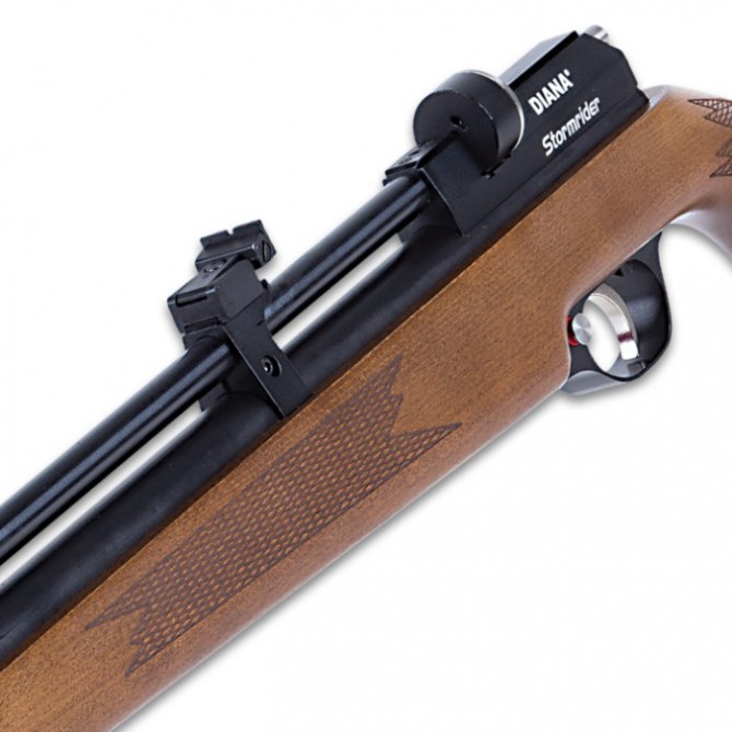 En cuanto a la óptica, la versatilidad de la Diana Storm Rider es sencillamente espectacular, ya que el tirador podrá realizar sesiones de disparos sin visor, con la incorporación de miras abiertas regulables, y también con equipamiento de elementos ópticos de precisión en el Raíl de 11 mm.