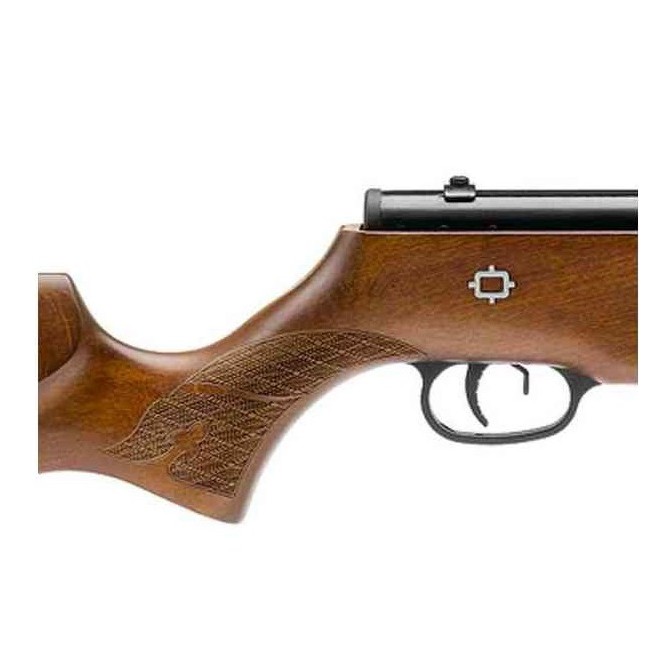 Óptica: La carabina está equipada con miras abiertas. Incorpora un Raíl Cola de Milano de 11 mm. Incluye un visor 4x32.