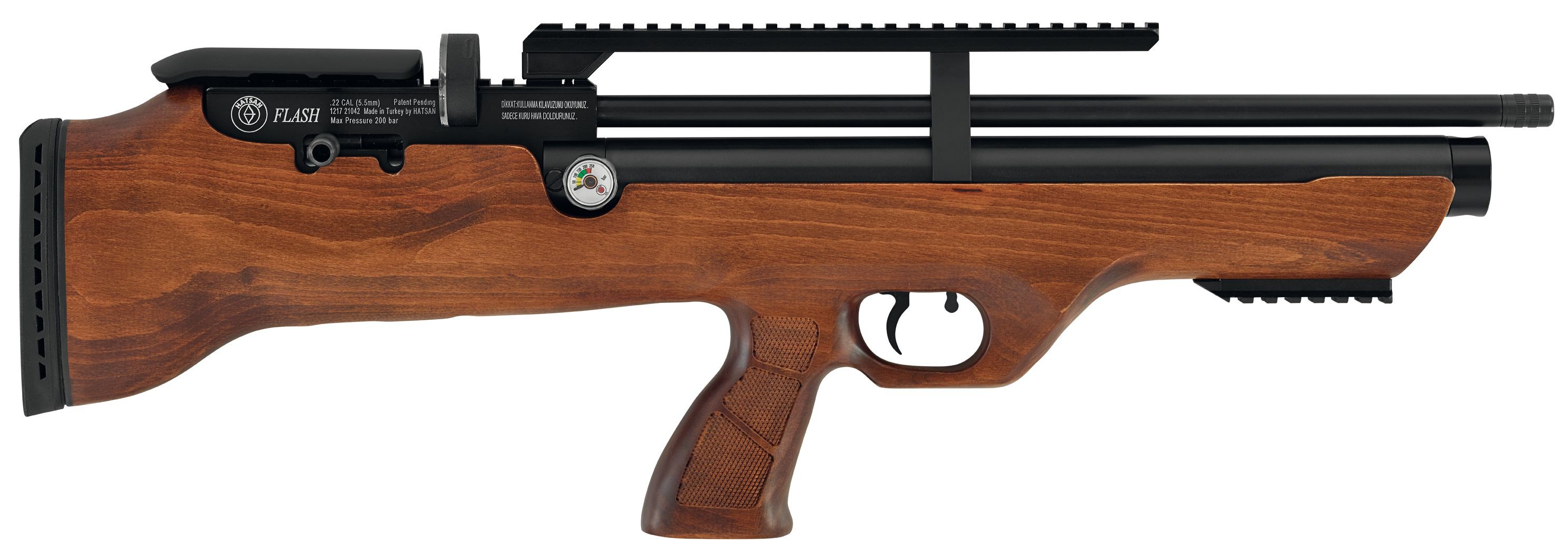 La Hatsan PCP Flashpup se acciona mediante palanca lateral, por lo que se realizará de forma práctica e instantánea. Así mismo, incorpora una culata regulable en madera de nogal turco tratada con carrillera ajustable y cantonera de goma, por lo que será una carabina de alta gama.