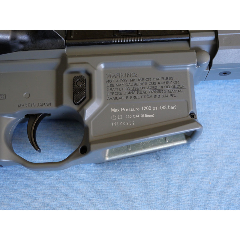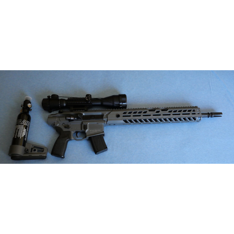 Los desarrolladores del departamento de I+D de Sig Sauer han incorporado como novedad a su catálogo este modelo de carabina que dispone de un sistema de carga PCP con capacidad para 215 cc y con 200 bar de presión. Estos datos posibilitarán un máximo de 70 disparos potentes y precisos sin recargar el depósito.