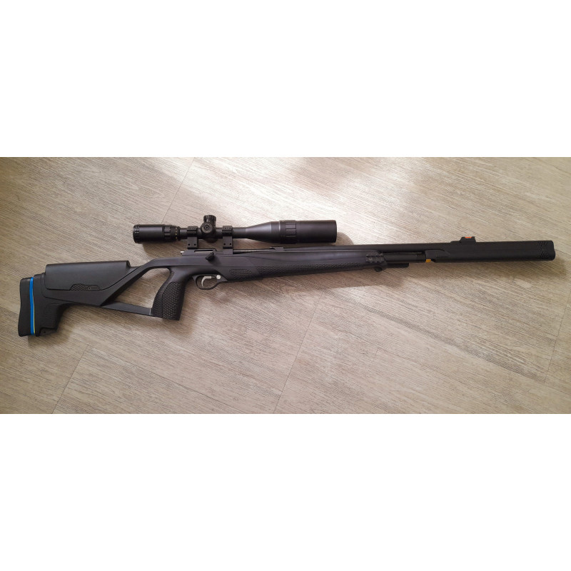 Mecanismo: Carabina ambidiestra con cañón de acero estriado, seguro de disparo manual y gatillo ajustable.