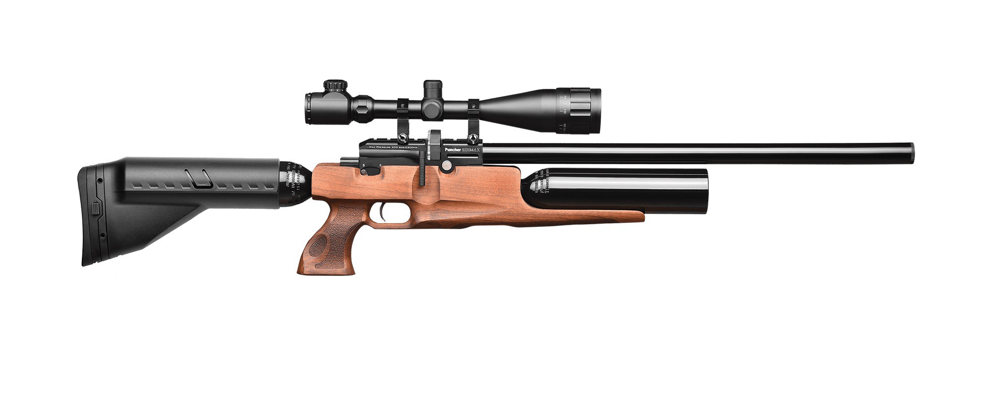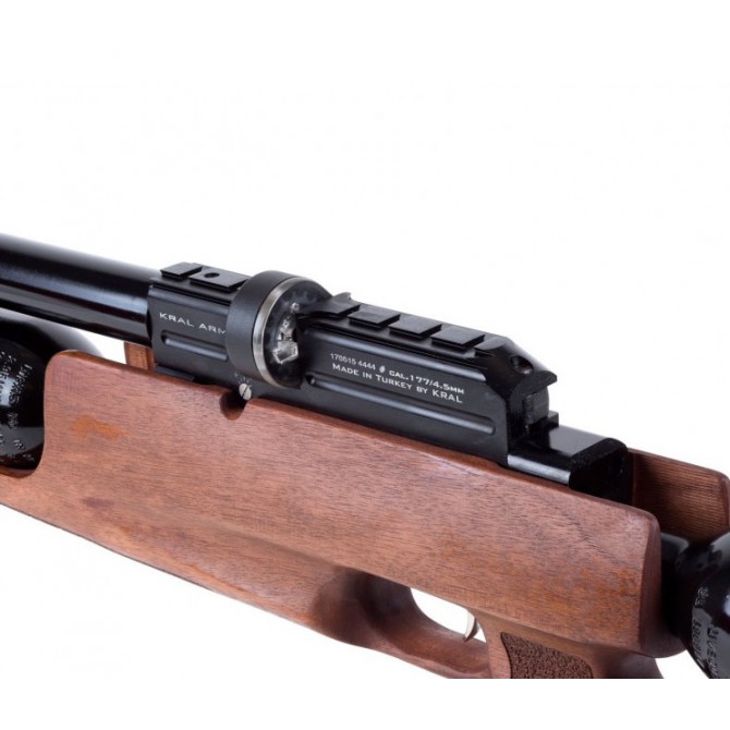 La tecnología de propulsión a través de un depósito externo se denomina PCP, y permite la realización de disparos potentes y precisos sin ningún debilitamiento estructural. Además, los desarrolladores de Kral han incorporado en la Puncher BigMax una culata de madera de nogal de última generación.