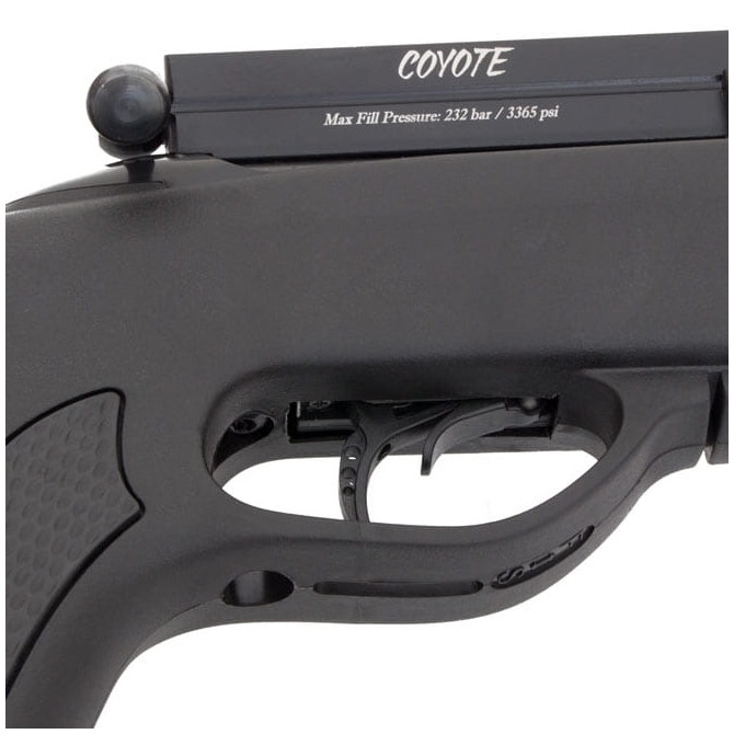 El modelo PCP Coyote Black lleva incorporado un mecanismo multi-shot que se acciona por el clásico cerrojo. Este sistema; denominado 10X Quick-Shot, permite disparar hasta un máximo de 10 veces sin tocar un balín, lo que convierte a esta carabina en un modelo idóneo para tiro deportivo o al aire libre por su tecnología de recarga ultra-rápida.