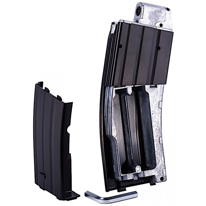 "Vista general del cargador de la Crosman R1, cargador robusto y pesado , réplica muy real del original, tiene una capacidad para 25 BBS. Diversión garantizada."