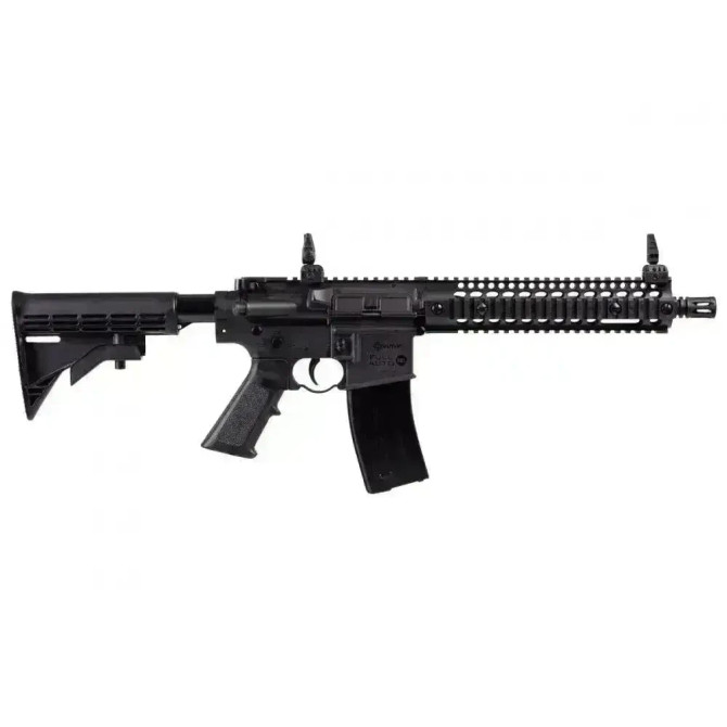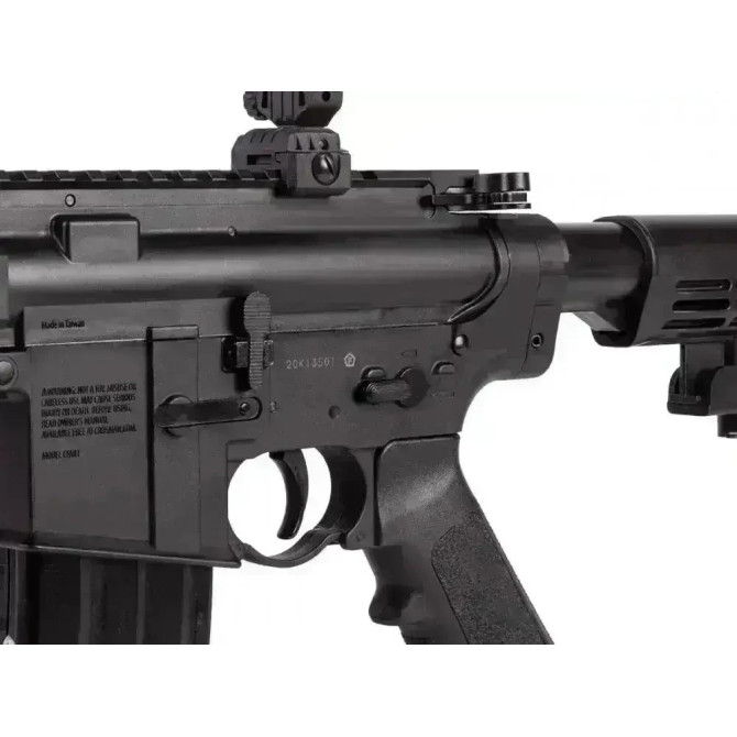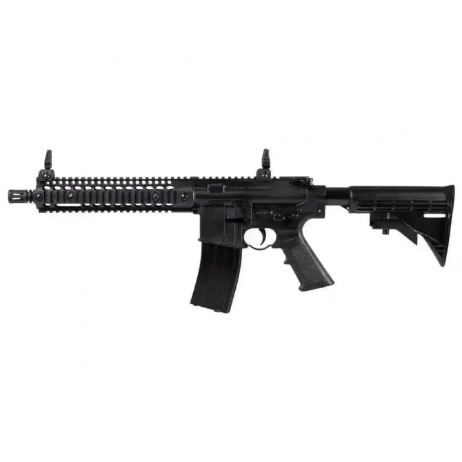 "Vista general de la Crosman R1, carabina de CO2 táctica muy realista y bonita. Cuerpo fabricado en fibra sintética,en la foto se puede apreciar que las miras son abatibles."