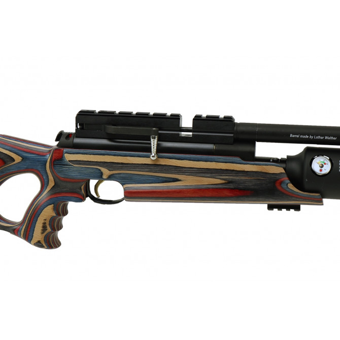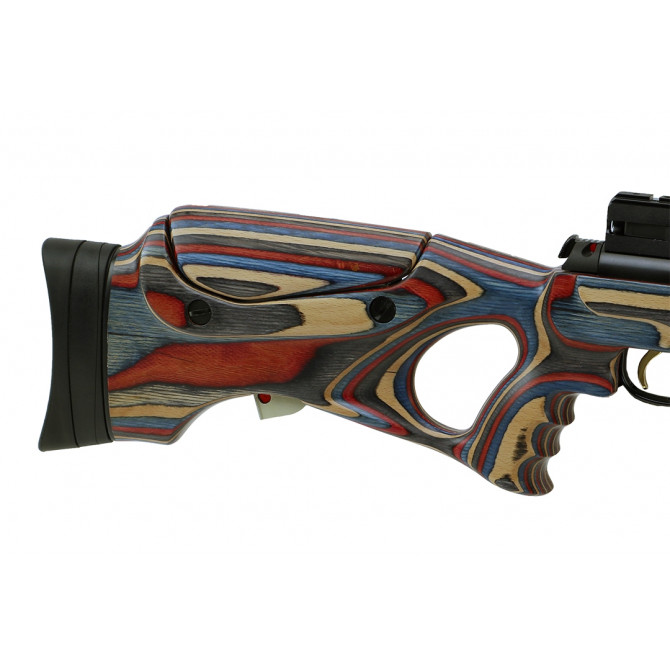Los desarrolladores de esta Hatsan PCP eligieron la fibra de carbono para su diseño del depósito, debido a su resistencia a la fatiga, a climas extremos y por ser un material muy ligero. Además, posee una culata Thumbhole con un orificio para el pulgar, que asegura el agarre y una cantonera de goma ajustable en elevación para una completa ergonomía.