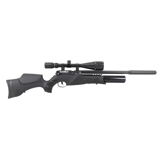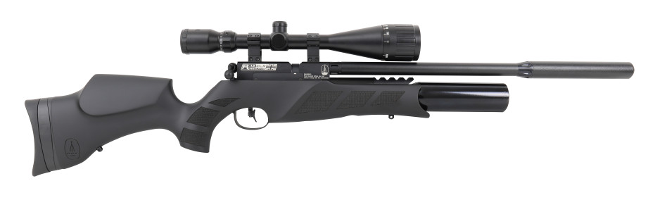 Esta carabina de aire pre-comprimido destaca por su acabado en polímero de color black soft touch, que le da un toque característico. Su culata destaca también por su diseño picado en sus laterales, que favorecen el agarre y evitan caídas de la carabina durante su uso. Posee también una cantonera de goma regulable, para ajustarse al máximo a la postura del tirador.