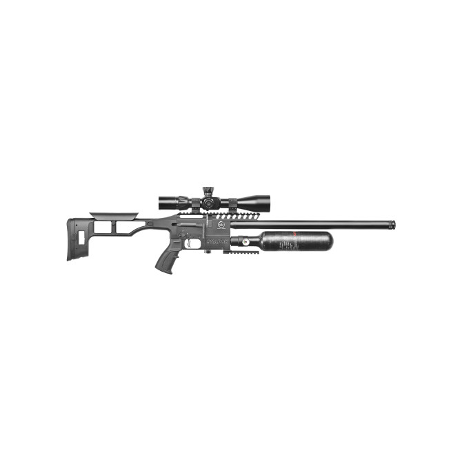 El cargador tiene una capacidad para 12 balines. Incorpora un depósito de 425 cc y una presión de llenado de 200 bares. Accionada mediante palanca lateral e incluye carril picatinny para poner un visor. Gatillo ajustable.