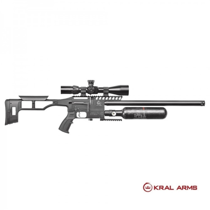 Kral Puncher Auto, es una carabina de PCP adaptable a semiautomatica. El cuerpo que incorpora es sintético y lleva un cañón de acero estriado de 48 cm. Es de calibre 5,5 mm y nos ofrece una potencia de 24 julios, lo máximo permitido en España. Potencia ajustable.