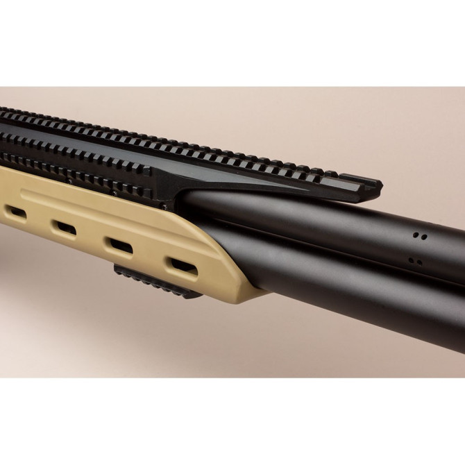 En el guardamanos puedes montar un bípode para mejorar la estabilidad del arma. Incorpora gatillo de dos tiempos para mejorar la precisión, además de ofrecernos más seguridad. En el propio gatillo se encuentra el seguro, que lo puedes activar mediante un botón.
