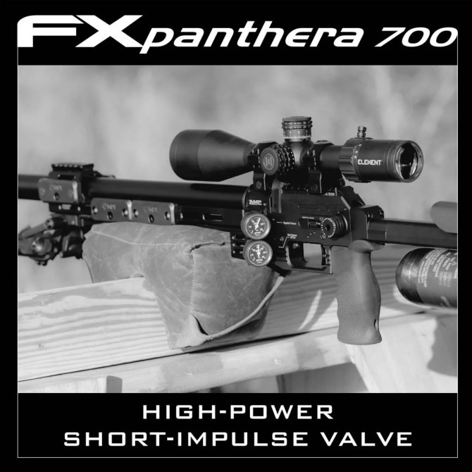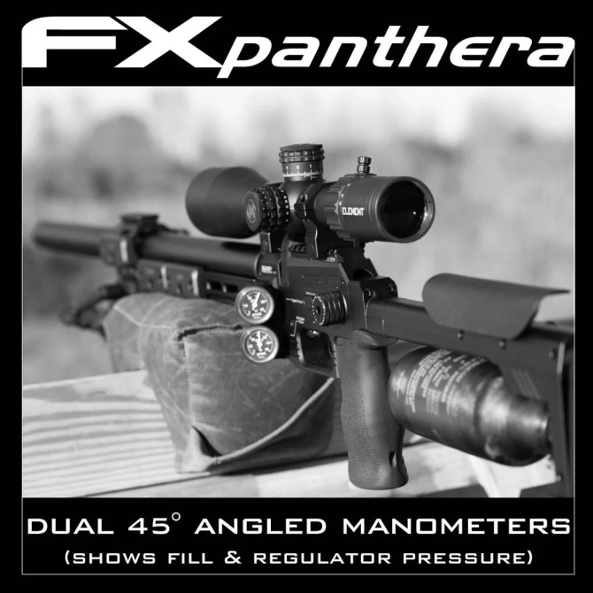 La fuente de aire es una botella de fibra de carbono de 300 cc colocada en la parte trasera y se llena a través de una desconexión rápida ubicada en la parte trasera. El Dynamic Block tiene una recámara más grande que los rifles anteriores que permite disparar proyectiles de hasta 13 mm de longitud. Utiliza el cargador Side-Shot estándar pero con una tapa más profunda de nuevo diseño para acomodar balas de mayor longitud. El FX Panthera emplea el sistema Quick Tune (el mismo que se encuentra en el FX Impact M3), utiliza un riel picatinny de 20MOA, viene de serie con una empuñadura AR de ángulo cero y tiene una manija de armado lateral ambidiestra que es reversible hacia la izquierda. lado del rifle. Los manómetros de doble ángulo en el lado izquierdo del bloque muestran la presión de la botella y la presión del pleno regulada.