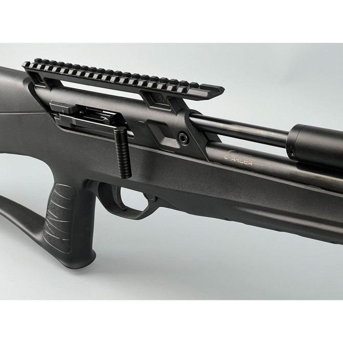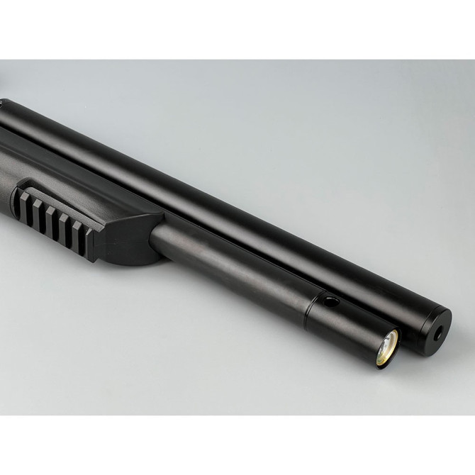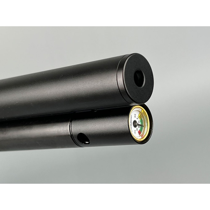 La Arcea PCP Snowpeak T-REX Bullpup incluye Carríl de 22 mm en la zona superior para instalación de visor. Además, incluye un Raíl Picatinny inferior para láser o linterna y un manómetro indicador de la presión.