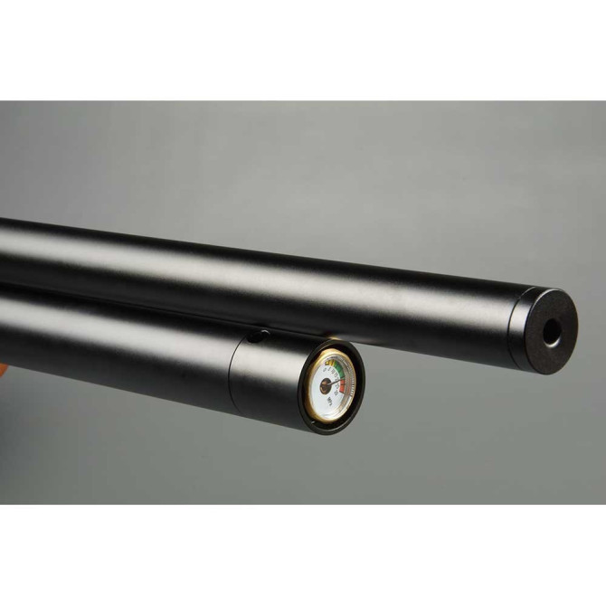 Para cargarla viene con un conector rápido tipo “foster” y un manómetro de presión en la punta del depósito. Puedes comprarla en 3 calibres diferentes: 1000 fps (4,5 mm) / 1000 fps (5,5 mm) / 900 fps (6,35 mm).