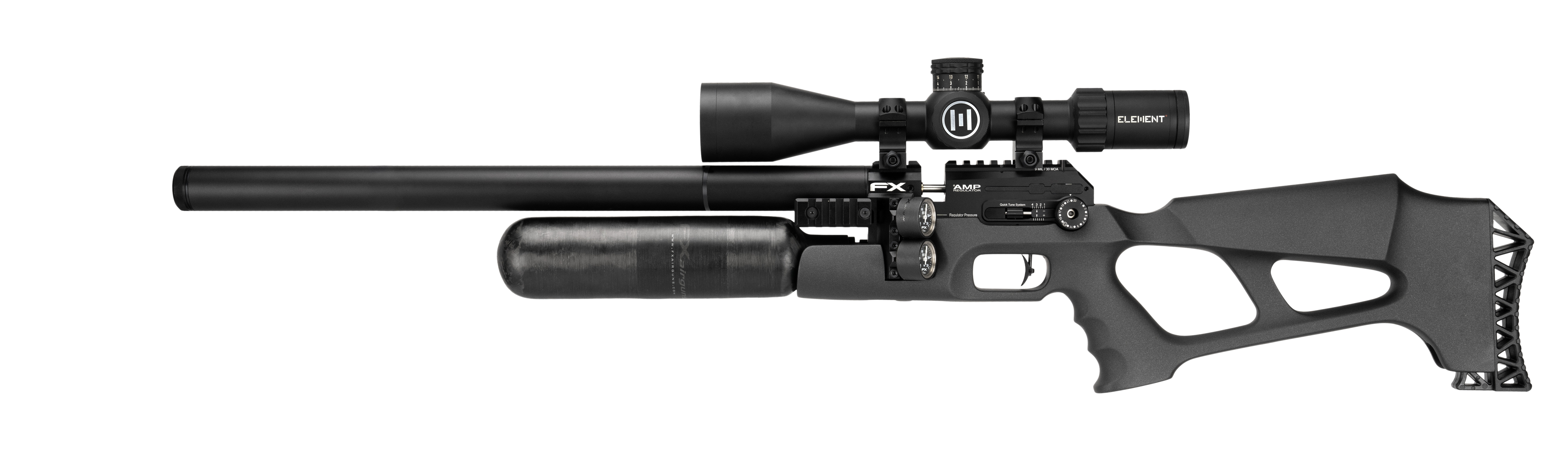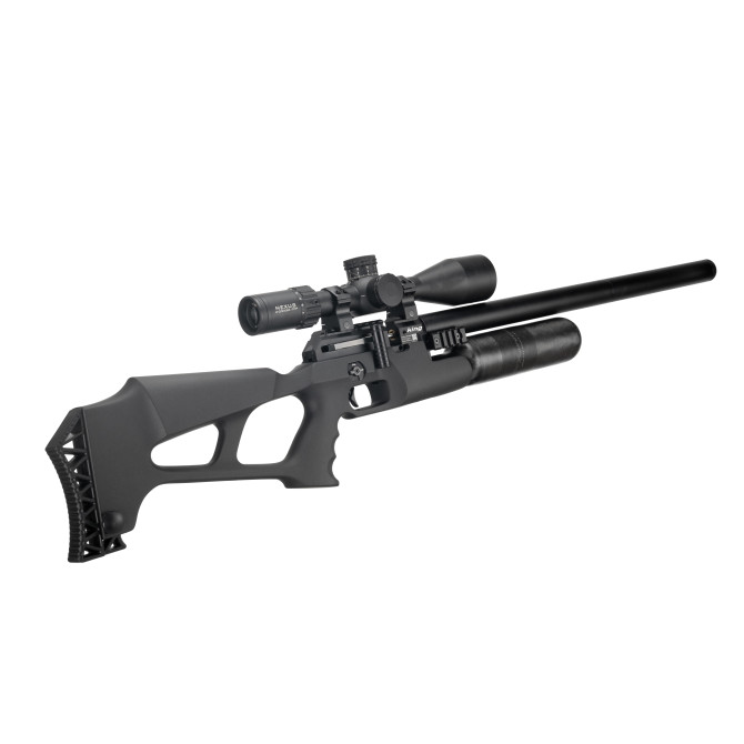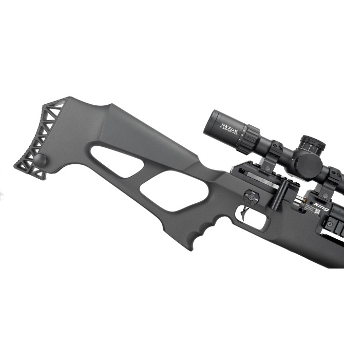 Una de las carabinas más impresionantes que puedes adquirir ya en Leopard es el modelo FX King Sintética, una carabina de PCP, con 24 julios de potencia, que es lo máximo permitido en España. Incorpora un depósito de 480 cc fabricado en fibra de carbono y 250 bares de presión de llenado. El cargador tiene una capacidad de 13 balines en calibre 7,62 mm. Incluye carríl 30 MOA Picatinny, para disparos más precisos a largo alcance.
