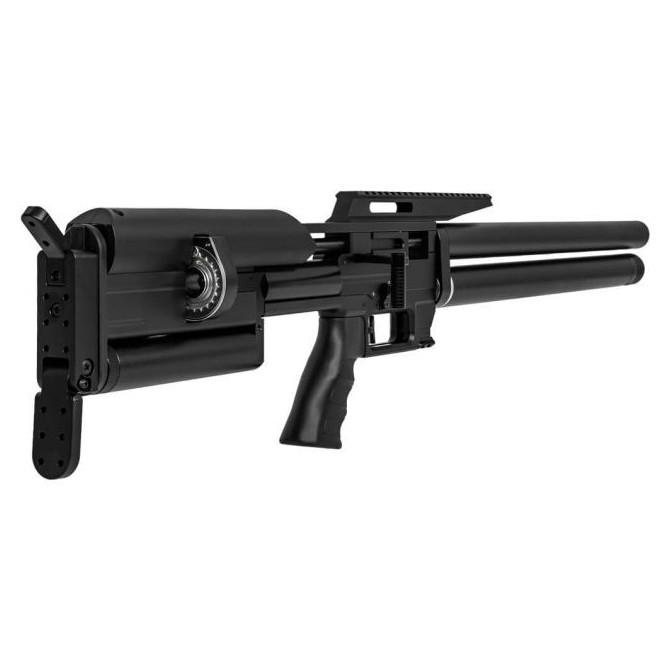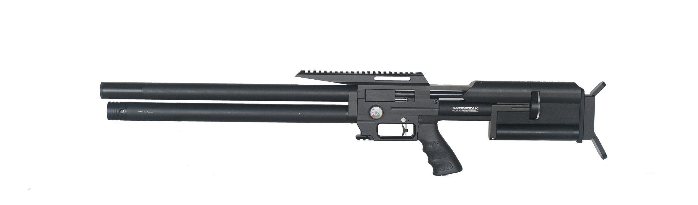 Carabina de PCP Snowpeak Max 1, con un depósito de 550 cc y 300 bares de presión máxima, además de regulador ajustable, con una gran precisión. Tiene una potencia de 24 julios e incluye moderador de sonido. Incorpora dos cámaras de aire a presión constante (Plenum). Gatillo de dos tiempos ajustable. Se puede poner moderador de sonido (no incluído). Calibre: 5,5 mm.