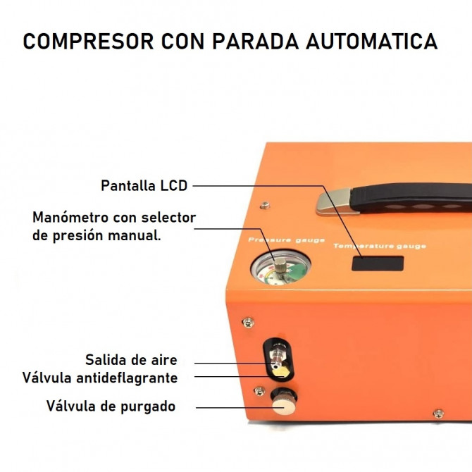 Los desarrolladores de Zasdar han creado este complemento para carabinas PCP con uno de los sistemas internos de presión más avanzados del mundo del aire comprimido. Incluye termómetro para medir la temperatura del compresor y, de esta forma, prevenir la sobre-carga interna. Además, cuenta con sistema de parada automática.