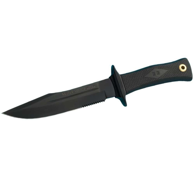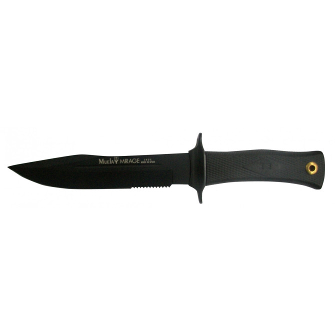 El cuchillo Mirage 18 está fabricado en España por la prestigiosa compañía de cuchillos Muela. Cuenta con una hoja de acero 420H, pavonada color negro y empuñadura de goma texturizada en acabado color negro, que aporta una protección antideslizante. Así, este modelo presenta un gran filo de hoja, por lo que es perfecto para cualquier actividad cinegética.