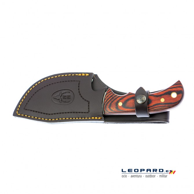 El perfil utilizado en la hoja de acero es Drop Point, que es una forma muy práctica y popular, ideal para cuchillos de caza o que vayan a ser utilizados en el monte. El filo recto tiene un vientre marcado para dar cortes profundos y largos, por lo que es un estilo muy polivalente.