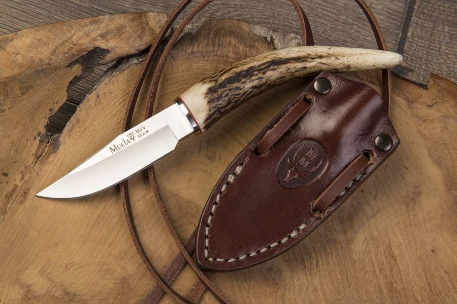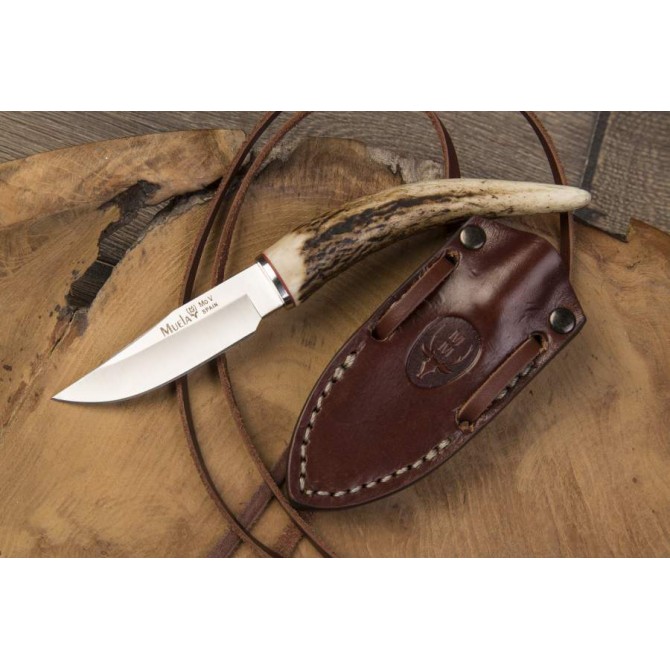 Cuchillo Muela ideal para el día a día porque se puede llevar al cuello. A pesar de su tamaño reducido es muy resistente, dinámico, agresivo y robusto. Hoja fabricada en acero Mova. Empuñadura fabricada en asta de ciervo. Incluye funda de piel de primerísima calidad y cordón para llevar en el cuello.