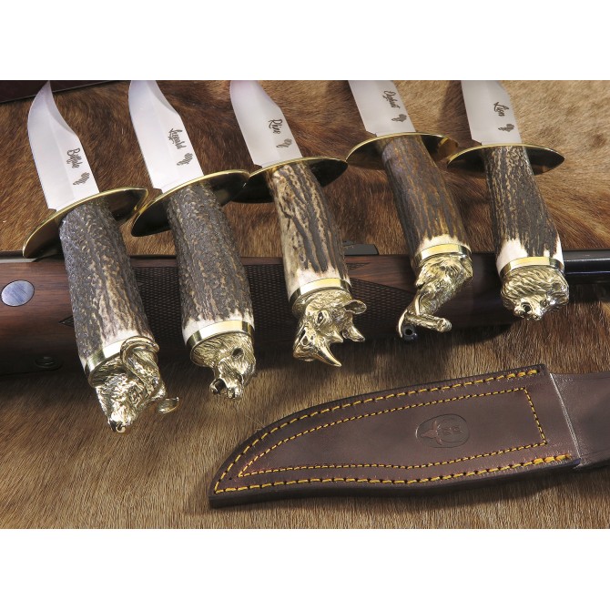 La prestigiosa marca de cuchillos Muela fabricados en España y de una calidad extrema, presenta la nueva línea de cuchillos de caza Muela Africa, con 5 acabados diferentes de empuñadura. Es un cuchillo con hoja fabricada en acero MoVa (1.4116). Guarda fabricada en latón y la empuñadura está fabricada en asta. Incluye funda de piel de primerísima calidad. Presentación en estuche de lujo. Pomo: Buffalo.