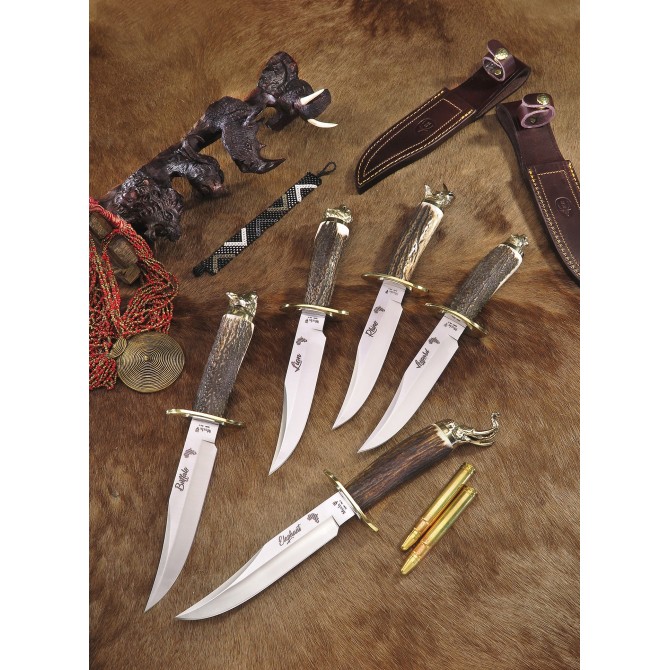 La prestigiosa marca de cuchillos Muela fabricados en España y de una calidad extrema, presenta la nueva línea de cuchillos de caza Muela Africa, con 5 acabados diferentes de empuñadura. Es un cuchillo con hoja fabricada en acero MoVa (1.4116). Guarda fabricada en latón y la empuñadura está fabricada en asta. Incluye funda de piel de primerísima calidad. Presentación en estuche de lujo. Pomo: León.