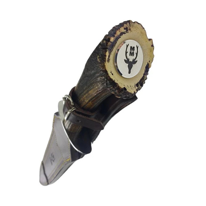 La empuñadura asimétrica de este cuchillo está fabricada en asta de ciervo con roseta, un material natural que no se corroe y que es muy duro y resistente. Este elemento le confiere un acabado único a cada pieza.