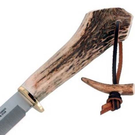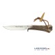 Cuchillo fabricado por Muela modelo Gran GRED-13H, especialmente indicado para el remate y la caza. Hoja fabricada en acero MoVa (1.4116). Empuñadura fabricada en asta de ciervo con defensa de latón. Funda de piel de color marrón.