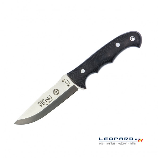 Cuchillo con hoja enteriza diseñado por Maykol Garcia y fabricado por Muela modelo Aborigen VIKING.J-11M, especialmente indicado para la caza. Hoja fabricada en acero MoVa (1.4116) con tratamiento criogénico (CRYO-T). Empuñadura fabricada en micarta de color negro. Funda de piel multiposición y ambidiestra, de color negro.