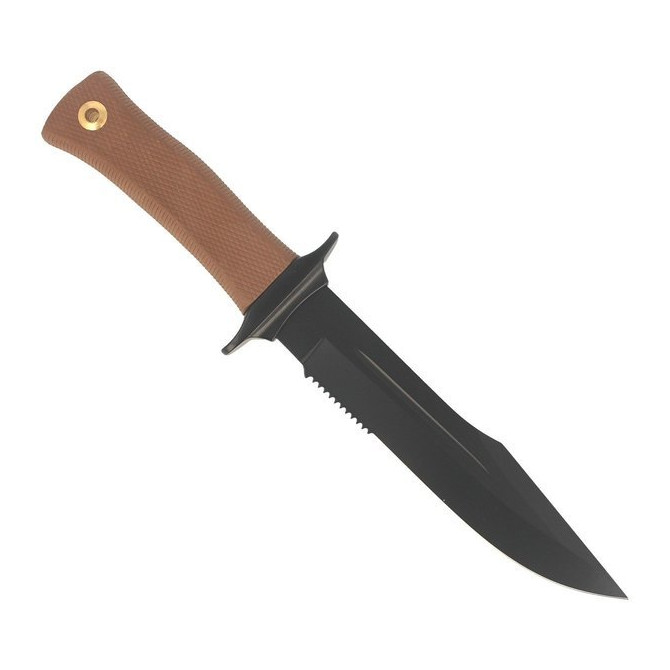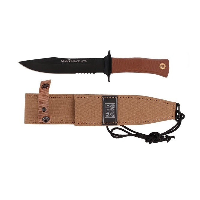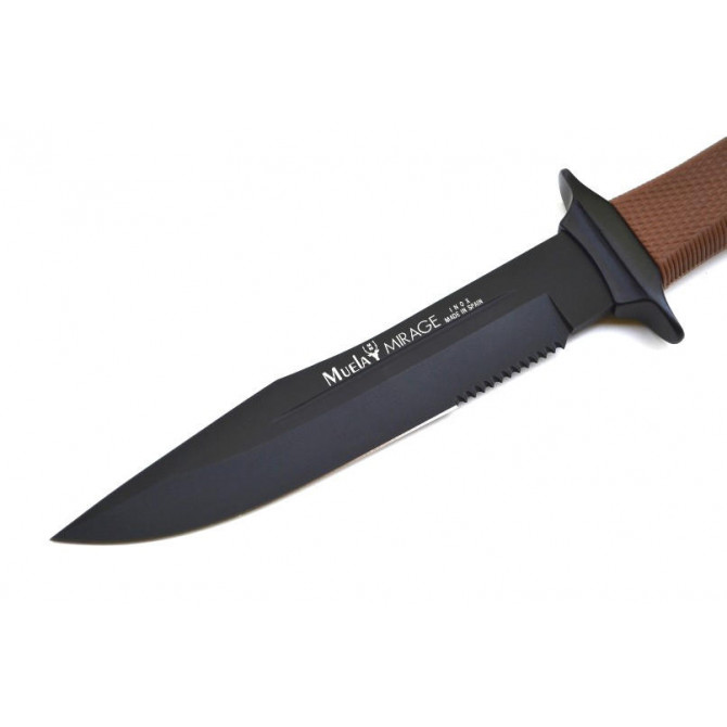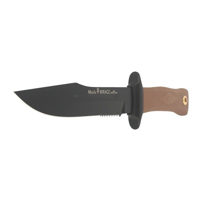 El cuchillo Mirage 18NM está fabricado en España por la prestigiosa compañía de cuchillos Muela. Cuenta con una hoja de acero 420H de color negro y empuñadura de goma y zamak en color arena, que aportan una doble protección antideslizante y antifricción. Así, este modelo presenta un filo de hoja mixto, por lo que es perfecto para cualquier actividad de caza o montería.