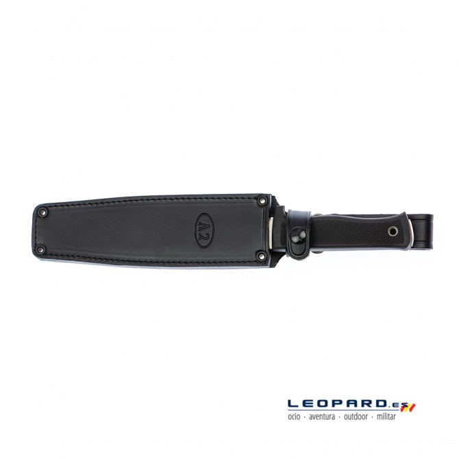 La firma Fallkniven ha equipado a este cuchillo A2 con una funda de cuero negra. Esta funda de alta calidad permite sujetar el cuchillo en el cinturón o la mochila. De esta forma, el usuario puede transportar el A2 de manera segura y cómoda, evitando golpes y arañazos que se pudieran producir.
