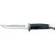 73/4" overall. 4" 420HC stainless blade. Durable black Phenolic composition handle with polished Duralumin guard and pommel. Black leather belt sheath.