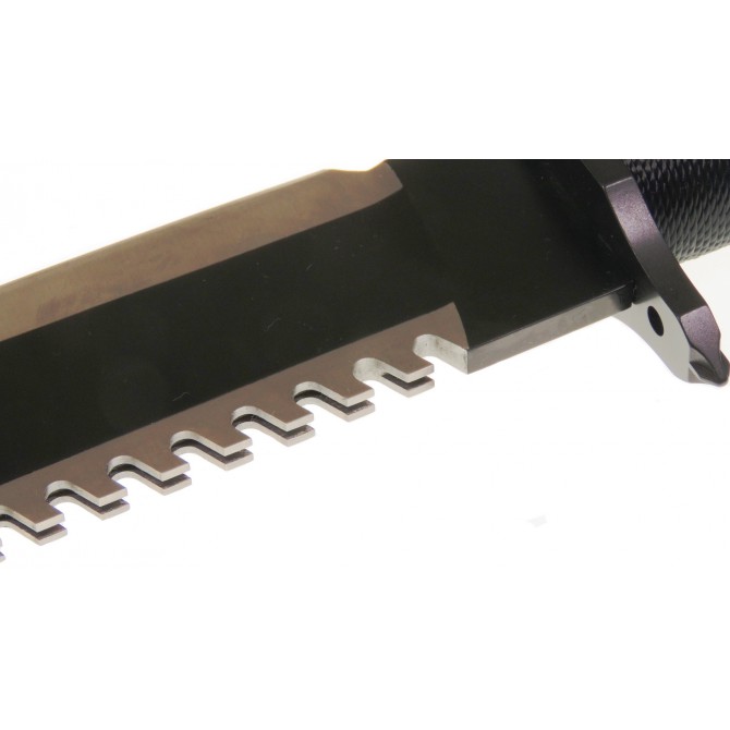 Los desarrolladores de Hollywood Collectibles Group han utilizado cordón de Nylon trenzado en color negro para la empuñadura del cuchillo Rambo First Blood Part II Edición Limitada. Este tipo de cordaje es muy suave al tacto y tiene una gran resistencia.