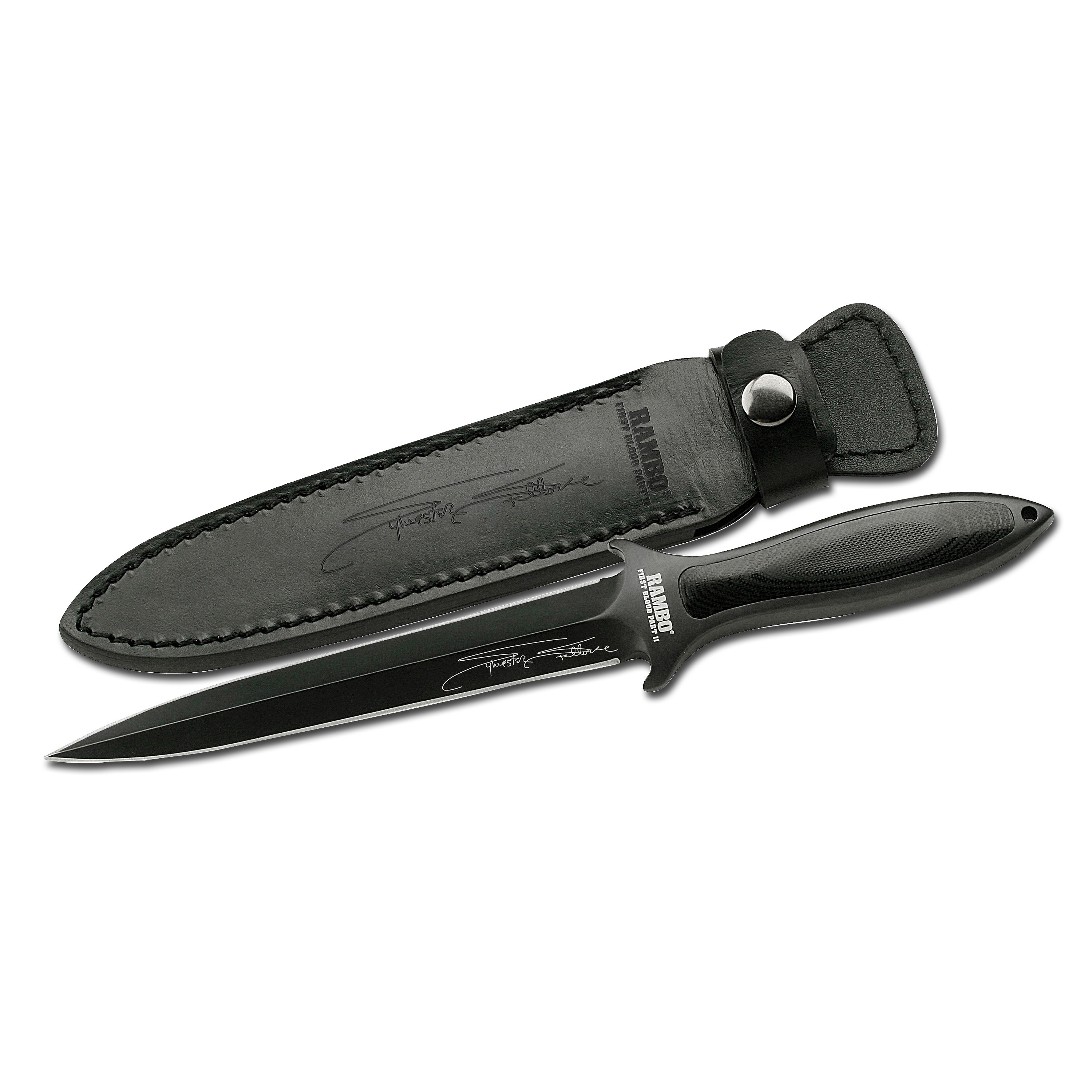 Un detalle que resalta y que la convierte en una edición limitada es la firma estampada del actor Sylvester Stallone. El acabado es en color negro (salvo el extremo del filo) para evitar reflejos y dar uniformidad con la empuñadura del mismo color.