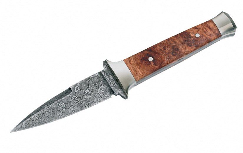 Boker Leo Damascus Boot Knife. 7" overall. 2 7/8" false edge hand forged damascus steel dagger blade (300 layers). The damascus steel is forged out of the barrel of the German battle tank Leopard in the "Small Pyramids" pattern. Amboina burl wood handles with nickel silver bolsters. Serialized. Leather boot clip sheath. Wood presentation case.