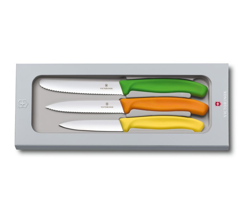 Set 3 cuchillos Victorinox de legumbres. Incluye 1 cuchillo de hoja serrada de 11 cm sin punta ideal para las legumbres y la carne, 1 cuchillo de hoja serrada de 10 cm con punta igualmente apto para todo tipo de legumbres y carne también y 1 cuchillo de hoja lisa de 8 cm. Presentación en caja de regalo.