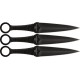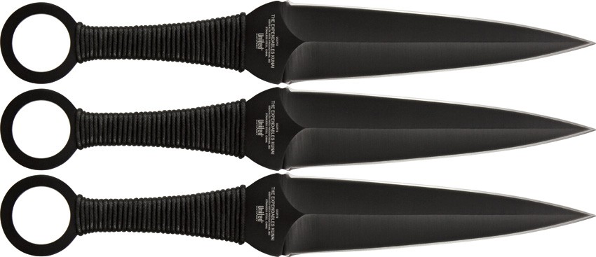 Set de 3 cuchillos lanzadores de la marca United Cutlery modelo Kunai The Exphendables. La hoja esta fabricada en una sola pieza de acero AUS-6 anodizado. Empuñadura encordada con agujero para el dedo en la parte posterior. Incluye funda de Nylon para pernera que permite multiples opciones de transporte.