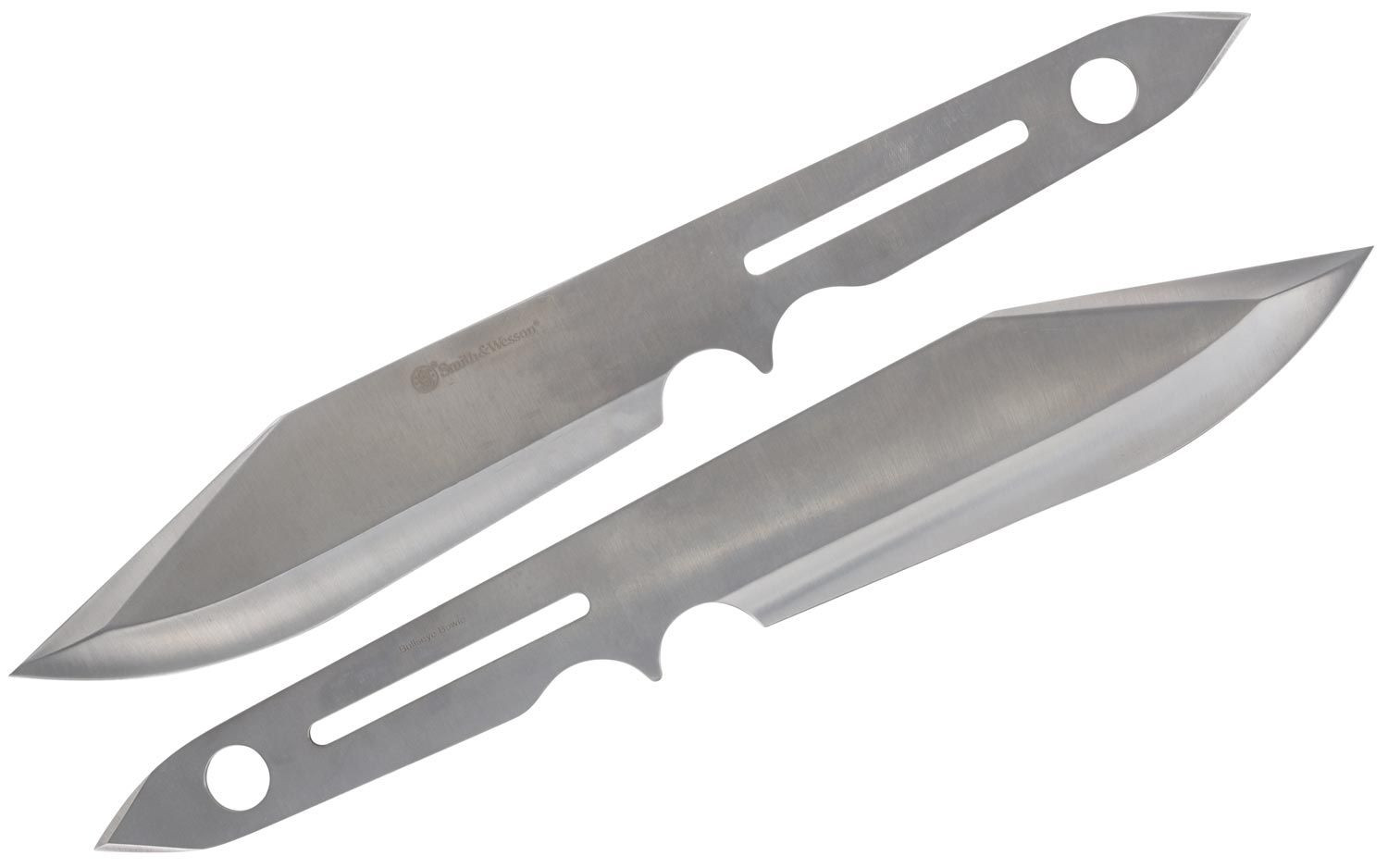 14" (35.56cm) overall. 7" (17.78cm) satin finish stainless blade. One-piece construction. Lanyard hole. Set of two. Dual pointed ends. Black nylon belt sheath. Clam packed.