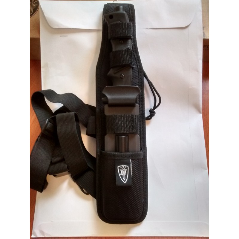 Aquí podemos observar la funda del cuchillo que es de cordura y tiene unas abrazaderas que son elásticas para poder fijarlo a la pierna