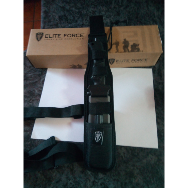 "Vista general del cuchillo ELITE FORCE 703 kit con su caja original, viene con dos fundas, una de cordel viene con gomas elásticas para una sujeción perfecta a la pierna y la otra, la del cuchillo es muy blanda y gomosa pero resistente, muy buena compra."