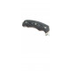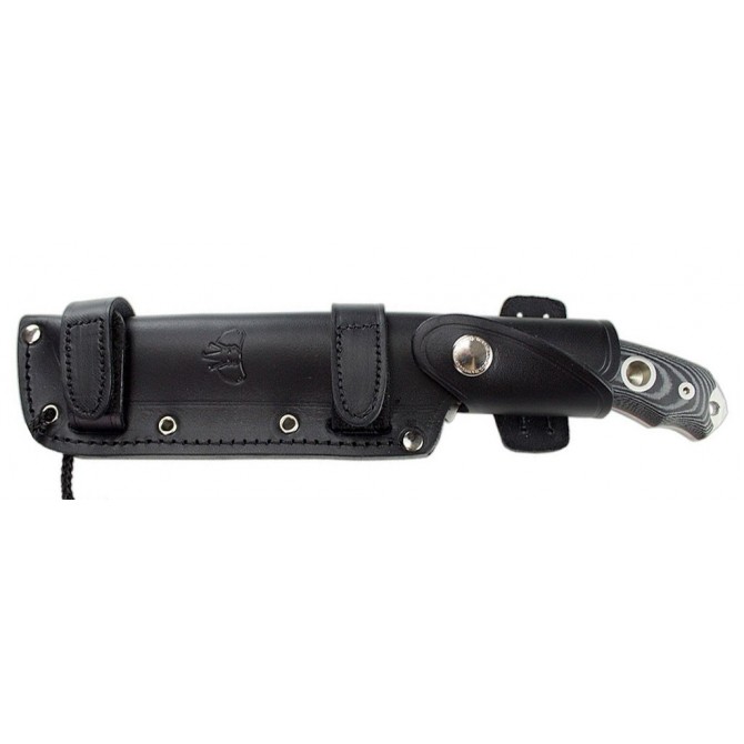 La empuñadura de este cuchillo está fabricada en Micarta, un material compuesto por diferentes materiales textiles unidos con resinas fenólicas. Cuenta con un acabado negro con un separador rojo.