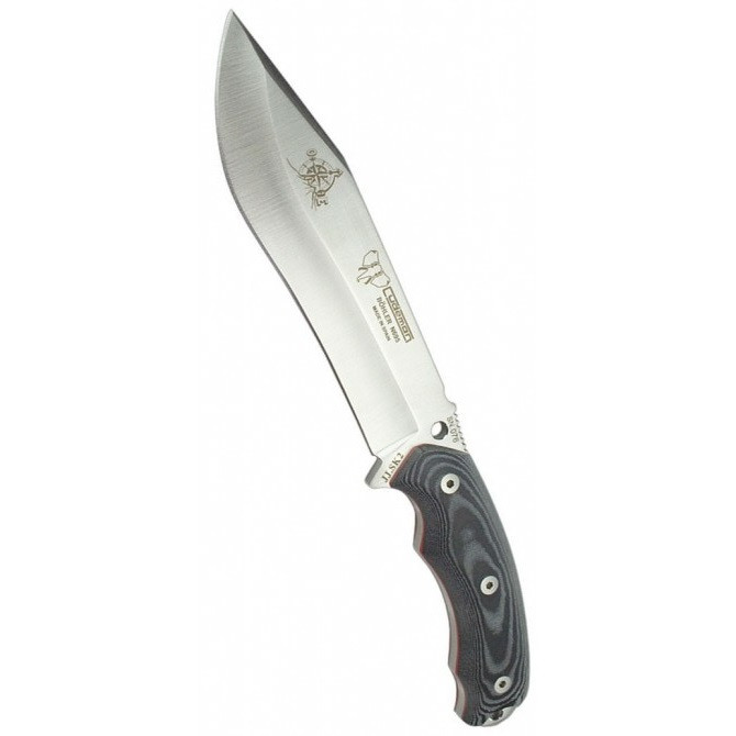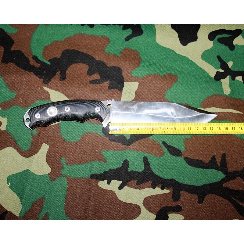 Imagen del cuchillo en su cara anterior. Podemos observar que las cachas son de Micarta sujetadas por tornillos allen , y si nos fijamos posee un casquillo que más tarde os indicare para que sirve.