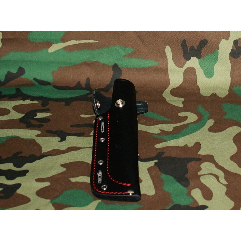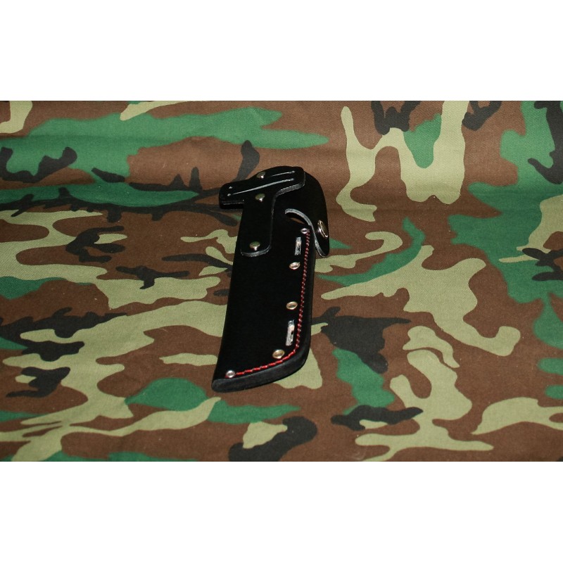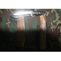 La funda de piel del cuchillo trae dos abrazaderas,de piel también, que se agarran con velcro . En el modelo con Kit sostienen el pedernal así como una piedra de afilar con relog solar etc. En mi caso las he quitado por que el velcro y el campo como que no van...